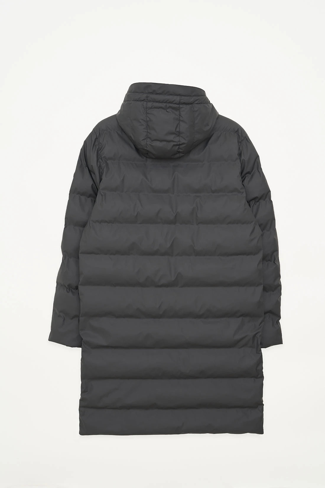 - Drawstring hood and high neck.