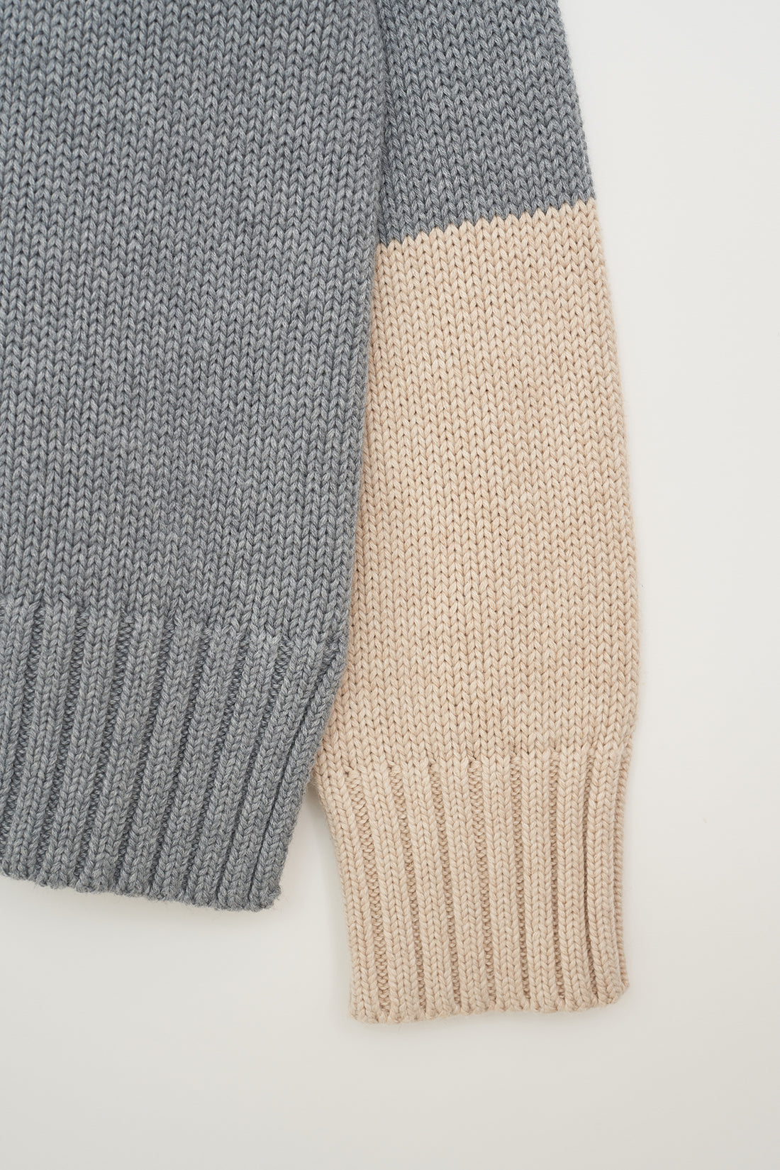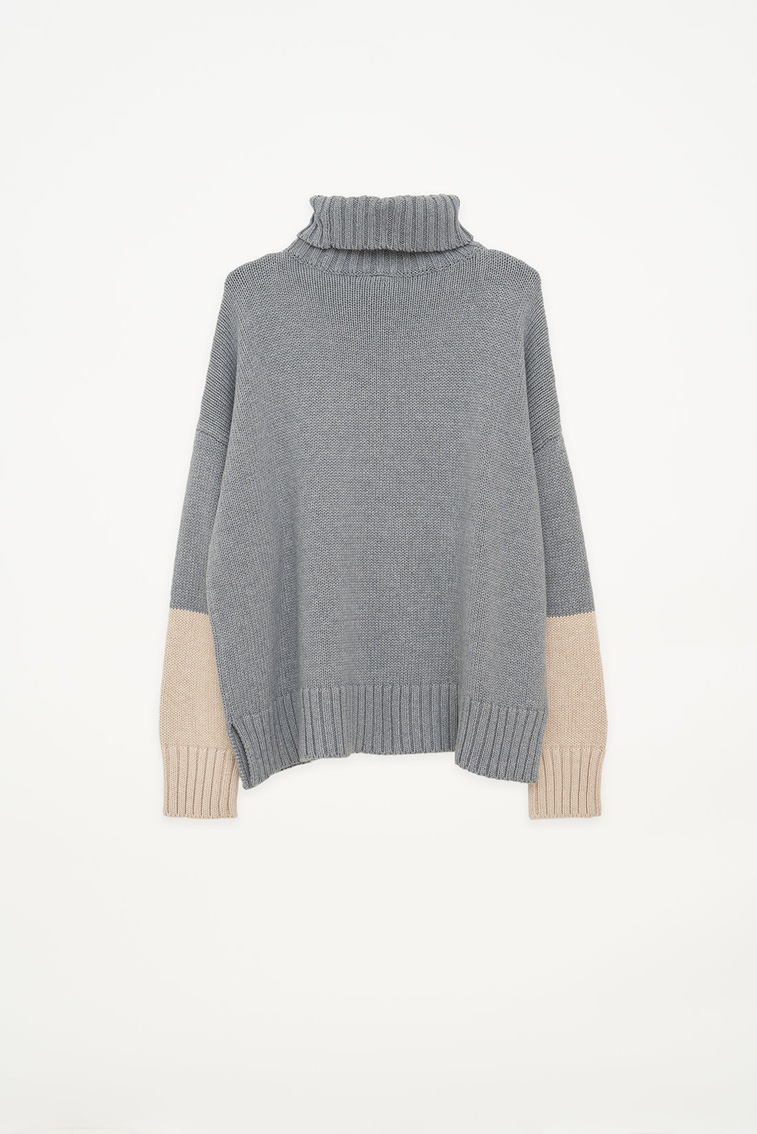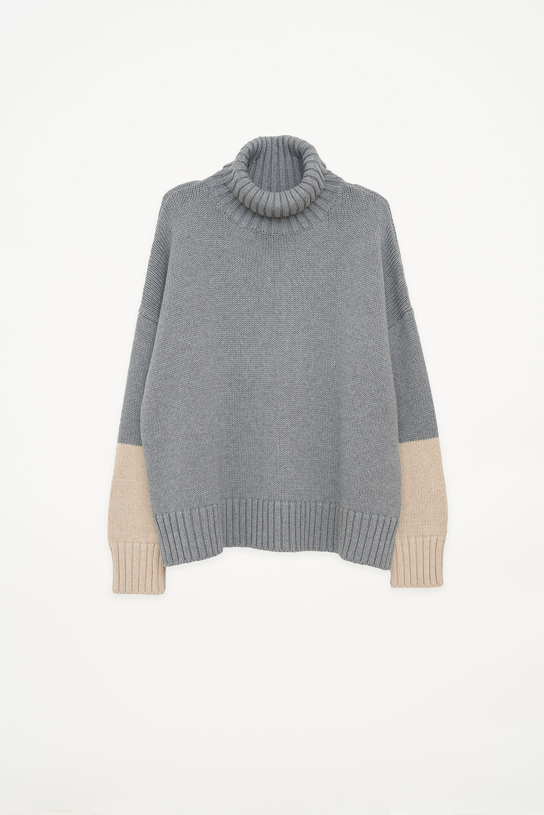 The Hau turtleneck sweater is knitted from a vegan wool that’s notably soft and warm. It features half sleeve in contrasting color and the hem is split to accentuate the relaxed silhouette. This sweater is cut in an relaxed fit and dropped shoulders.