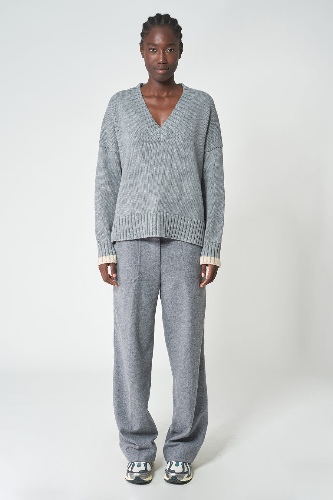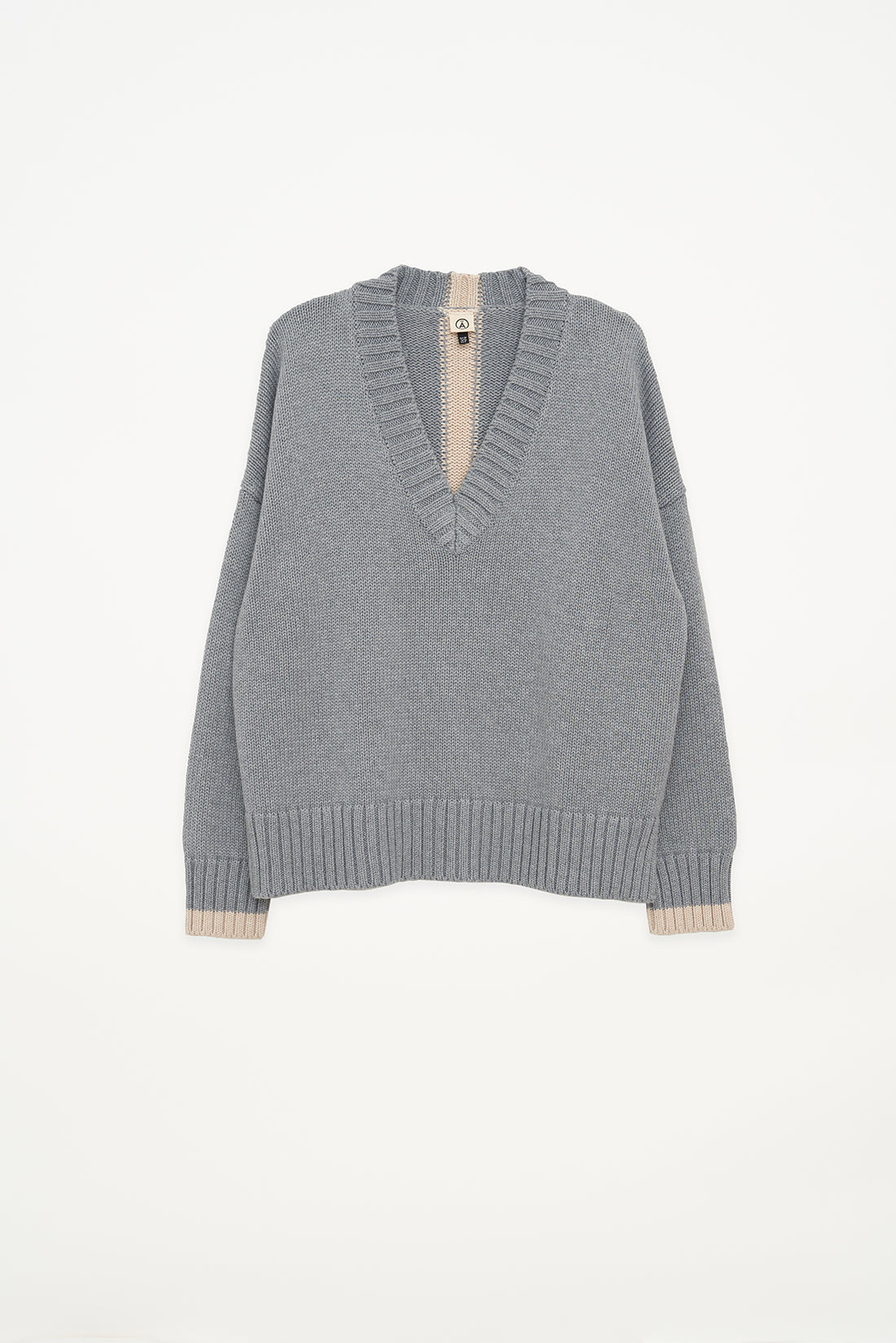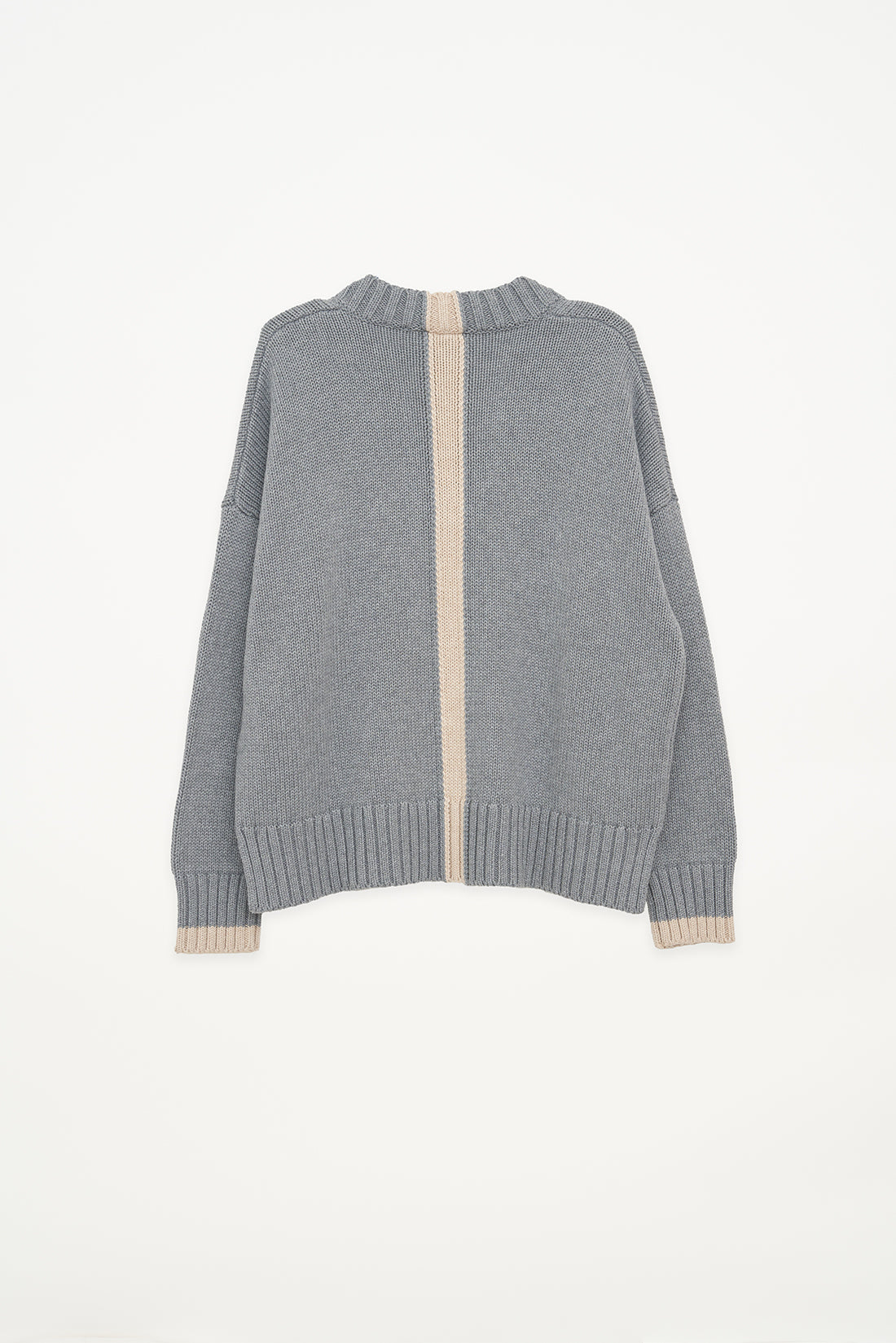 The Berf sweater is knitted from a soft adn warm vegan wool in different shades, creating a contrasting vertical stripe on the back and edge of cuffs. It has a relaxed silhouette detailed with a relaxed V neckline and the hem is split to accentuate the relaxed fit