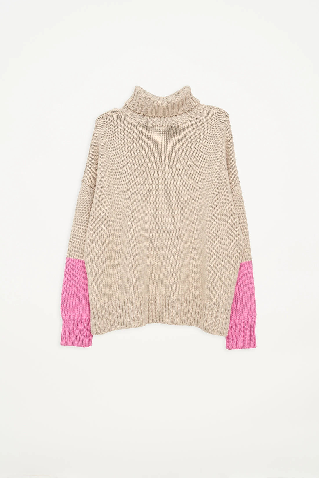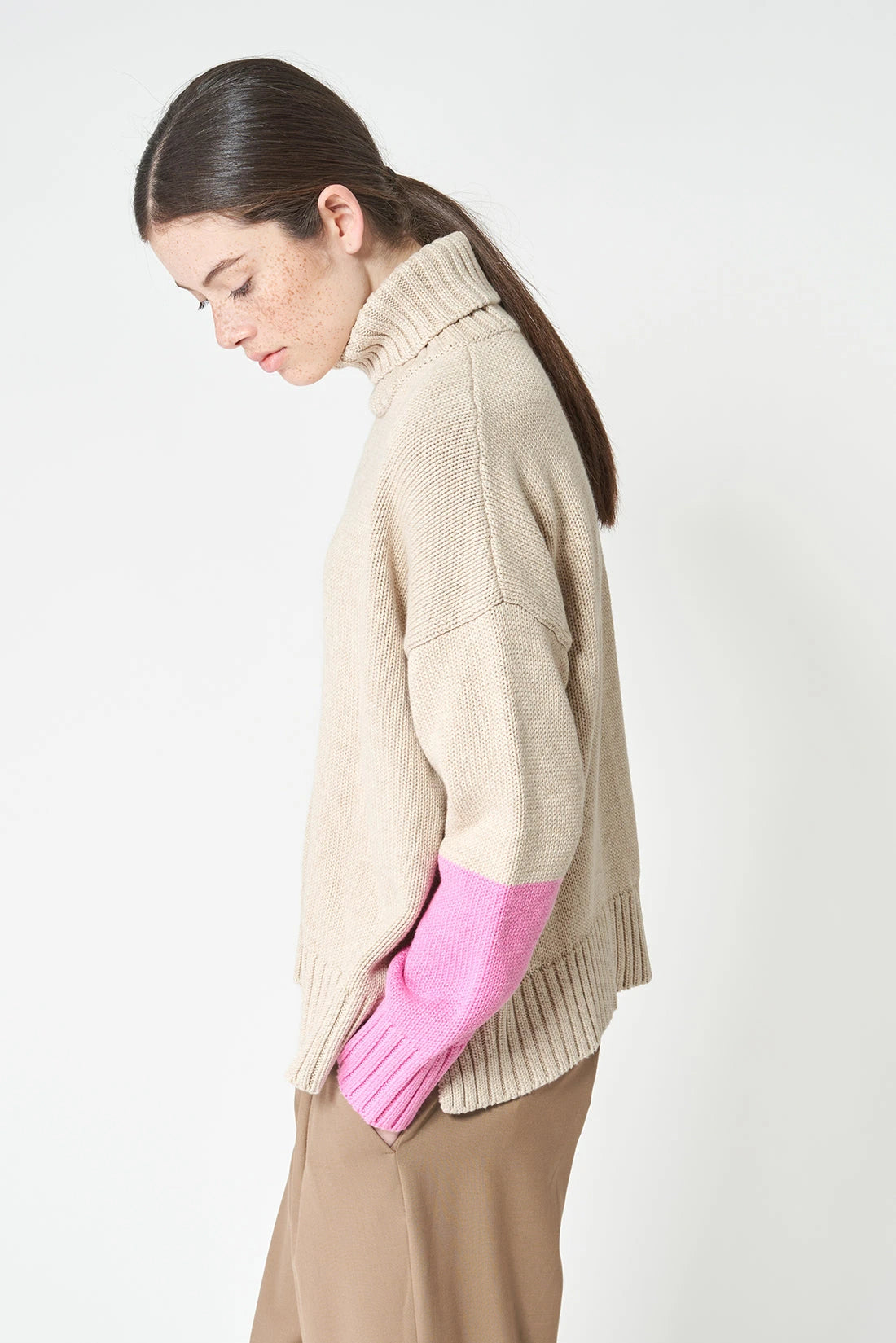 El jersey de cuello vuelto Hau está tejido con una lana vegana suave y cálida. Presenta media manga en contraste de color y el bajo tiene una abertura para acentuar la silueta. Este jersey tiene un corte amplio y los hombros caídos.