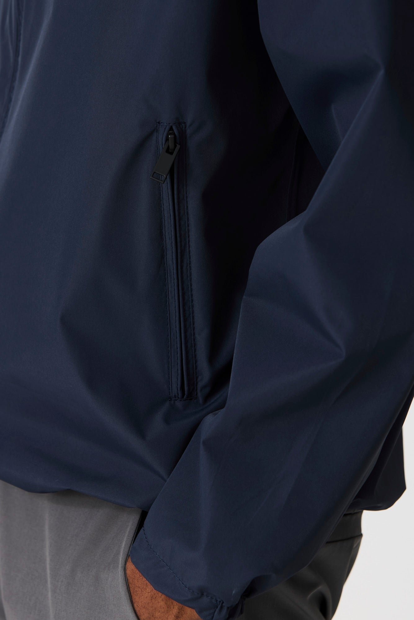 Poches latérales avec double passepoil et fermeture éclair étanche thermosoudée dissimulée.