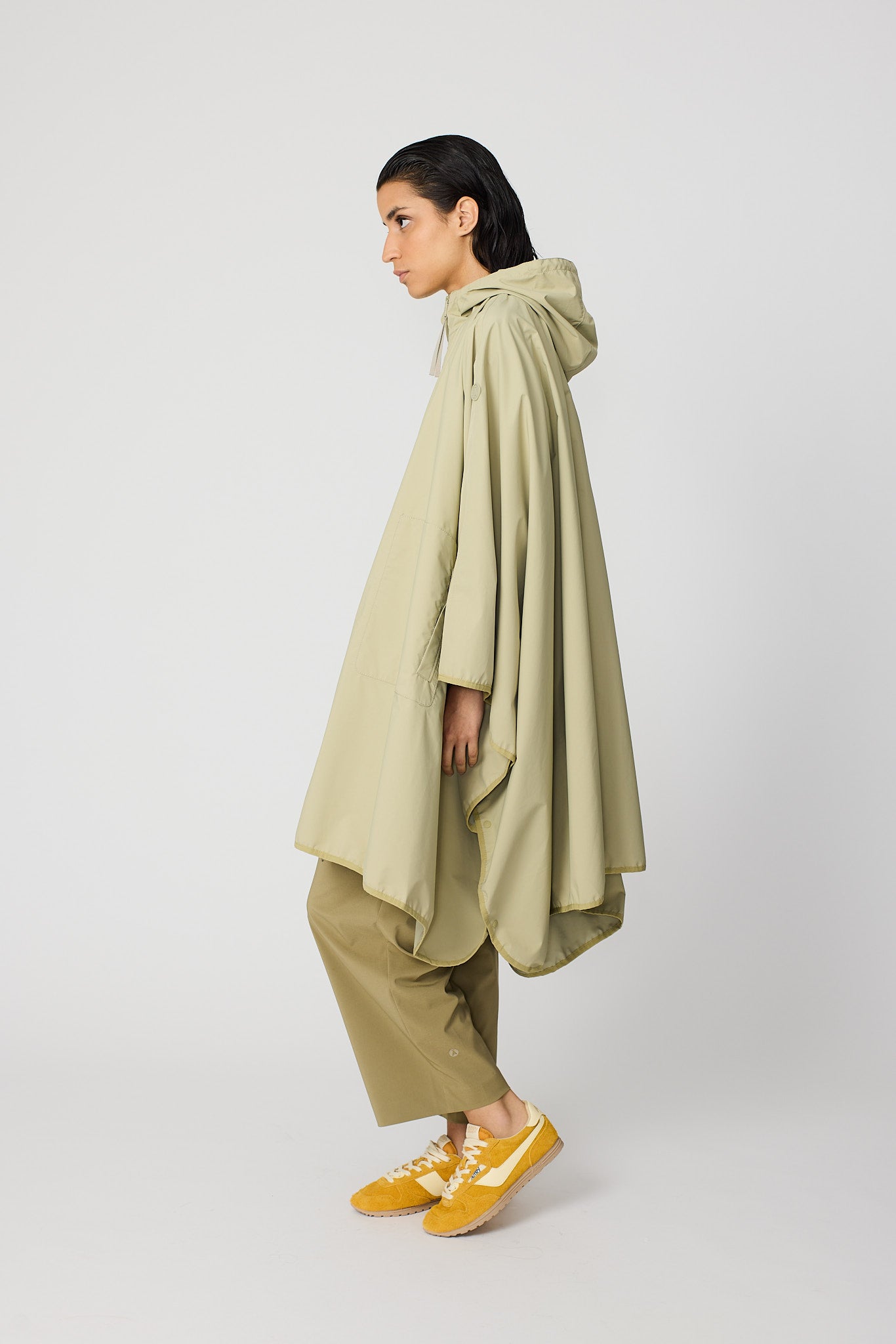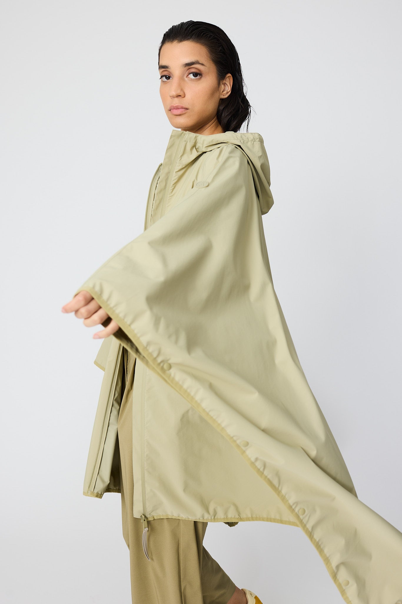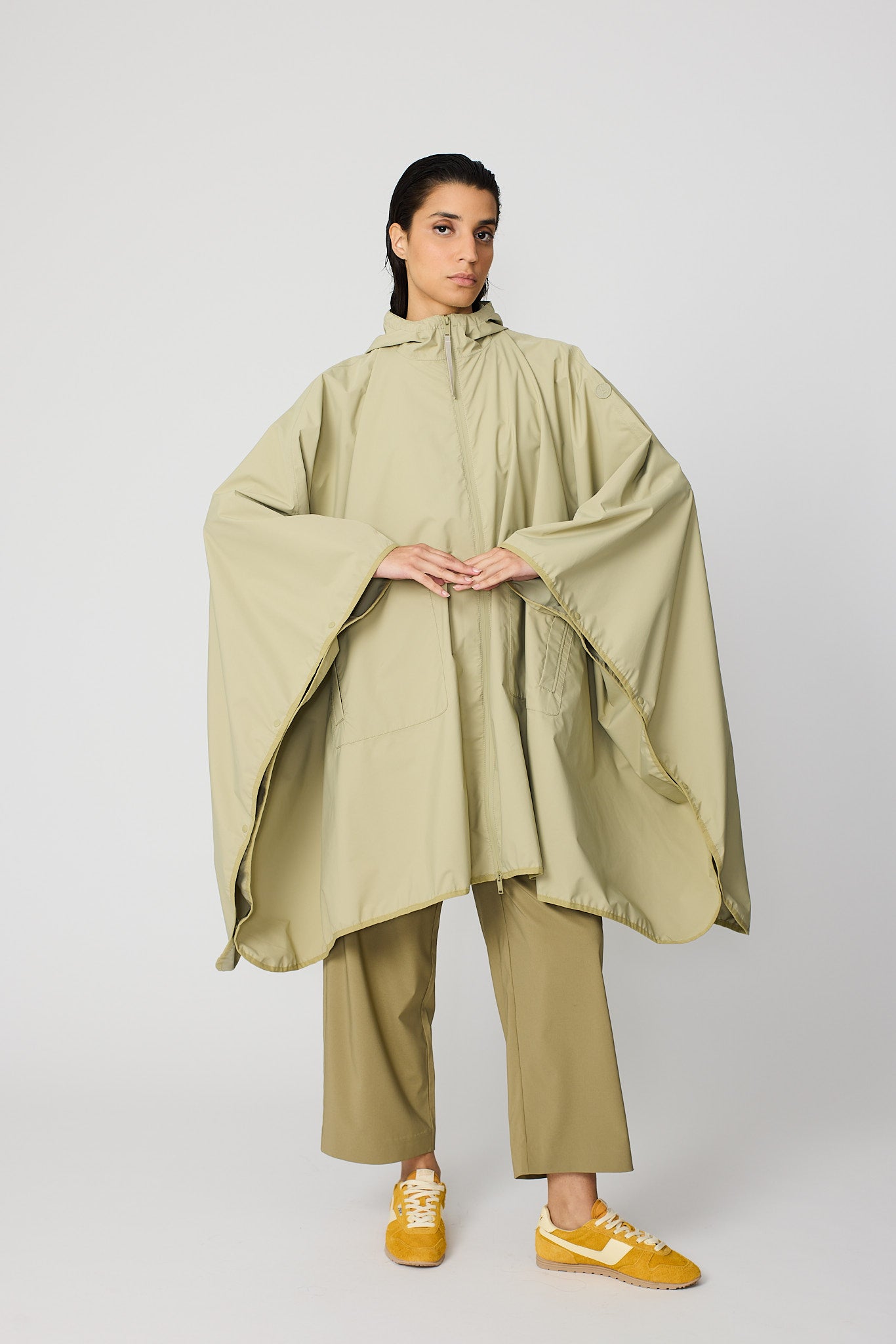 Vesi est une cape moderne et oversize confectionnée en tissu 100 % recyclé et respirant. Conçue comme une pièce unique, elle se superpose facilement sur n'importe quel look. D'une forme affirmée mais d'une sensation légère, c'est une pièce très pratique qui peut être pliée et rangée dans sa propre poche, ce qui la rend facile à transporter partout. Un design frais et contemporain qui allie durabilité, polyvalence et style.