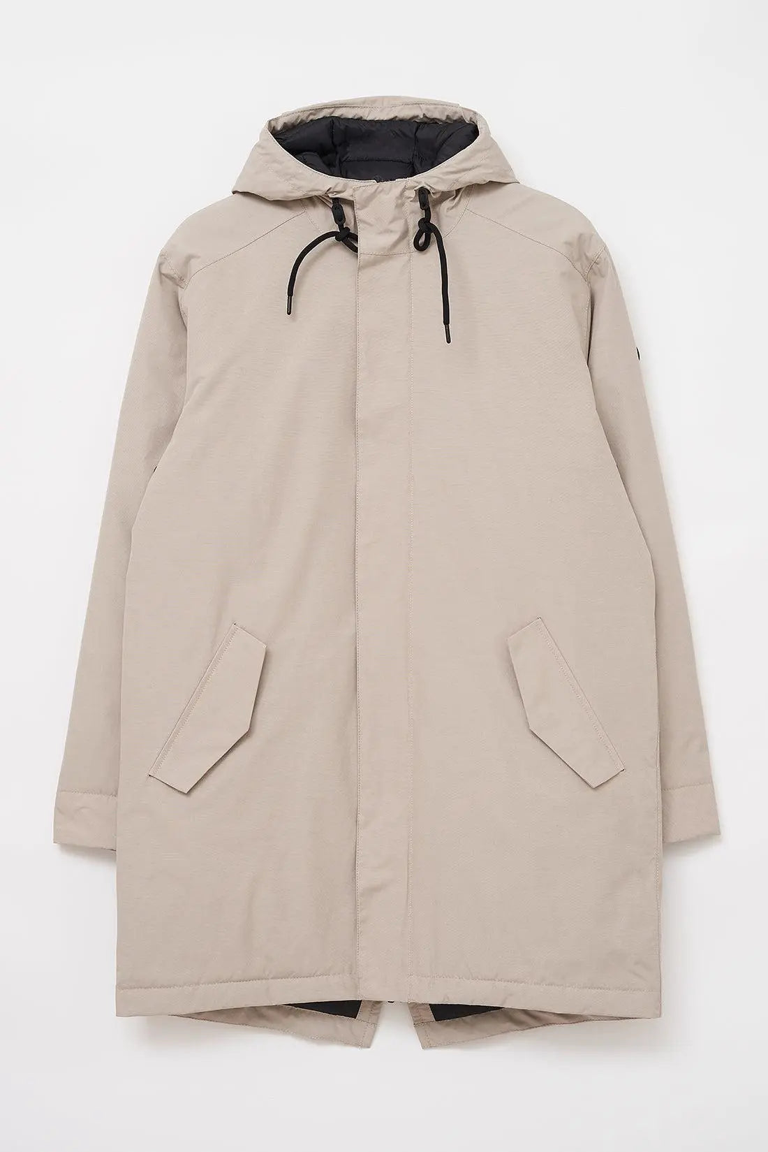 - Capucha de cordón con visera incorporada y cuello alto.