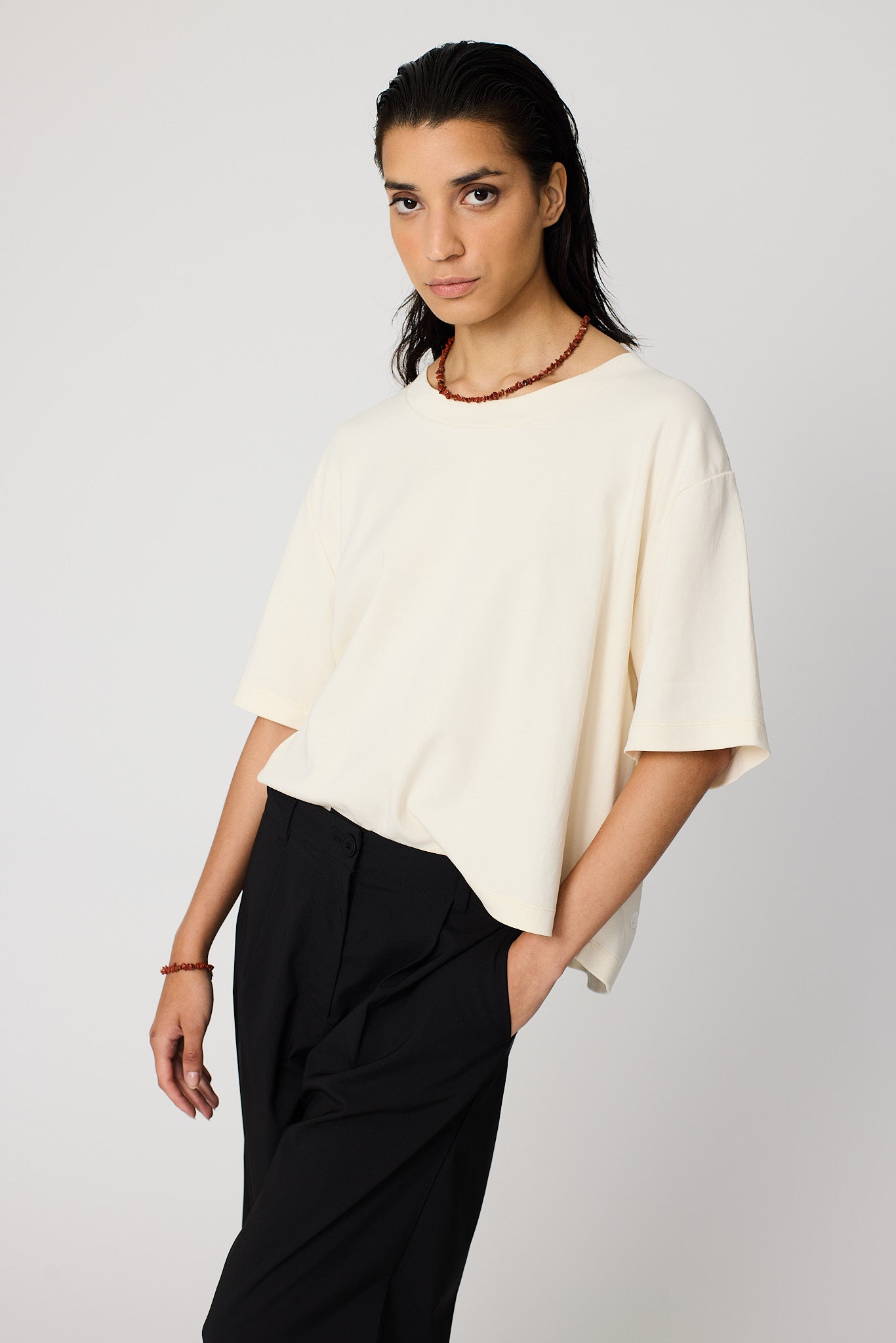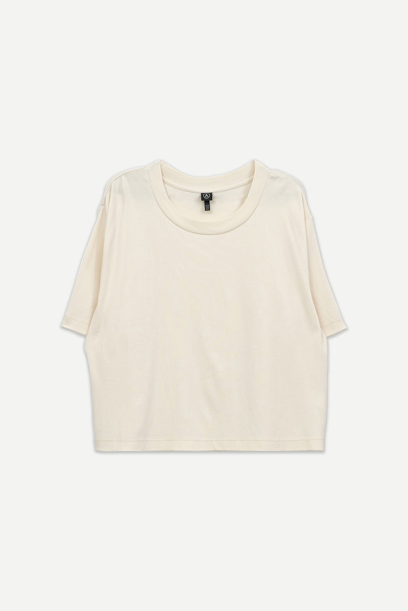 Tarpo es una camiseta fondo de armario confeccionada en algodón interlock suave, diseñada como un básico elevado para el día a día. Con cuello redondo, corte relajado, mangas caídas y un largo ligeramente mayor en la parte trasera, aporta un toque contemporáneo a una silueta atemporal. Suave y agradable al tacto, es un imprescindible con estilo sin esfuerzo.