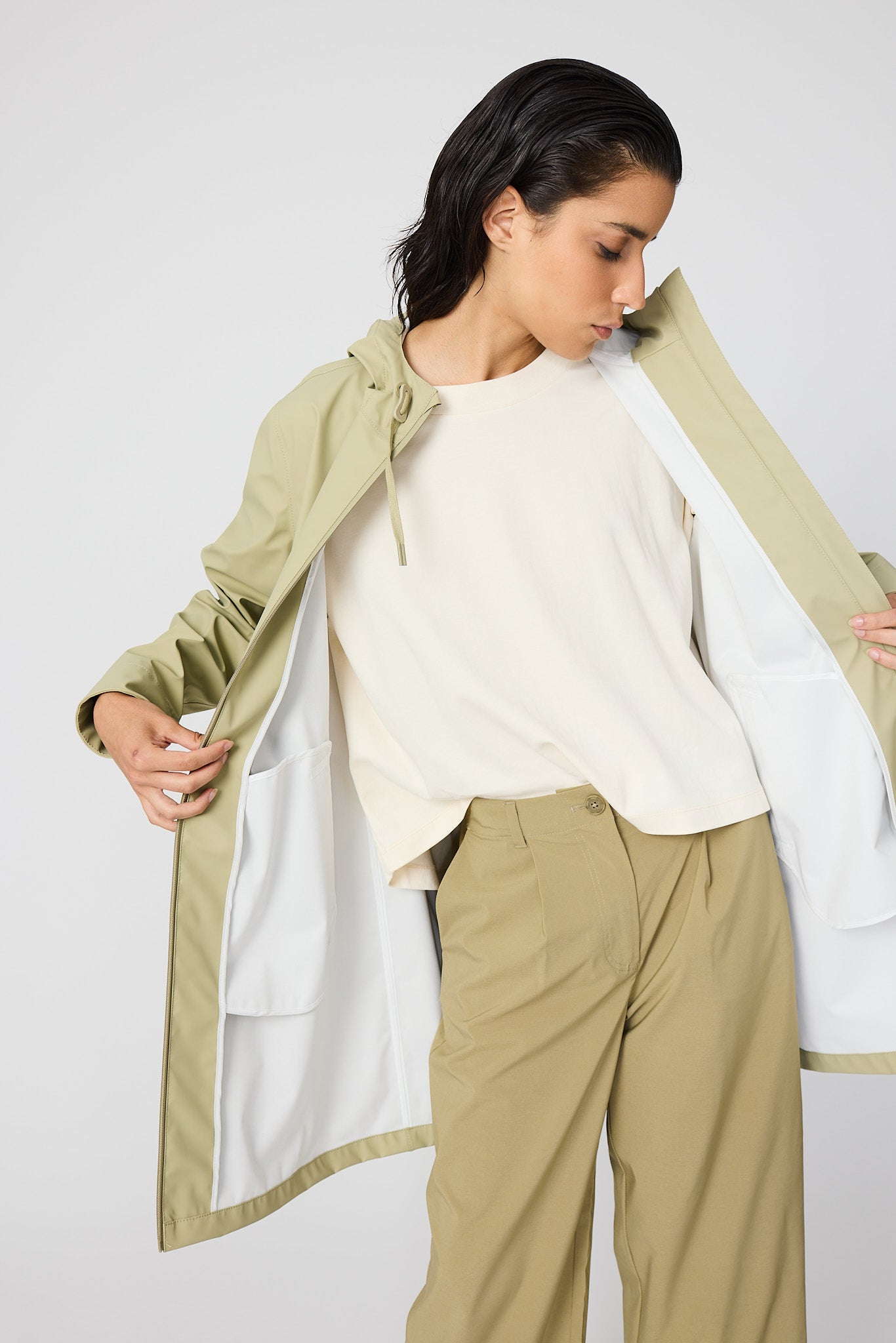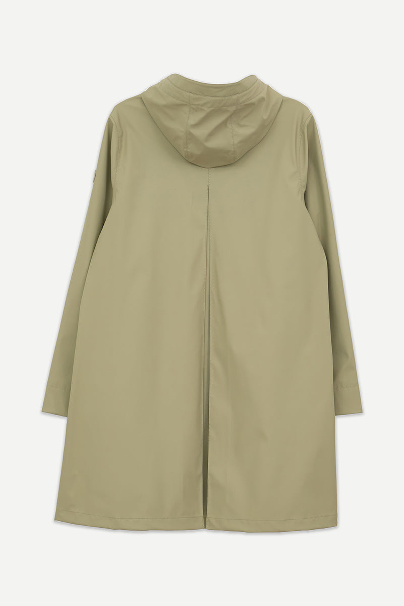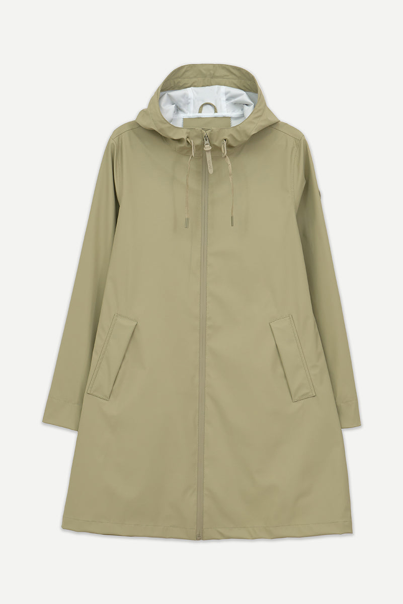 Chubasquero impermeable de mujer diseñado para el uso diario en temporadas de transición, el impermeable Nuovola está confeccionado con nuestro icónico tejido de poliuretano y cuenta con un pliegue en la espalda que aporta un volumen único en forma de A. El largo a mitad del muslo se complementa con una cremallera sellada en la parte delantera y con puños corta vientos en el interior de la manga para una protección adicional contra el clima más impredecible. Se ajusta a la talla real.