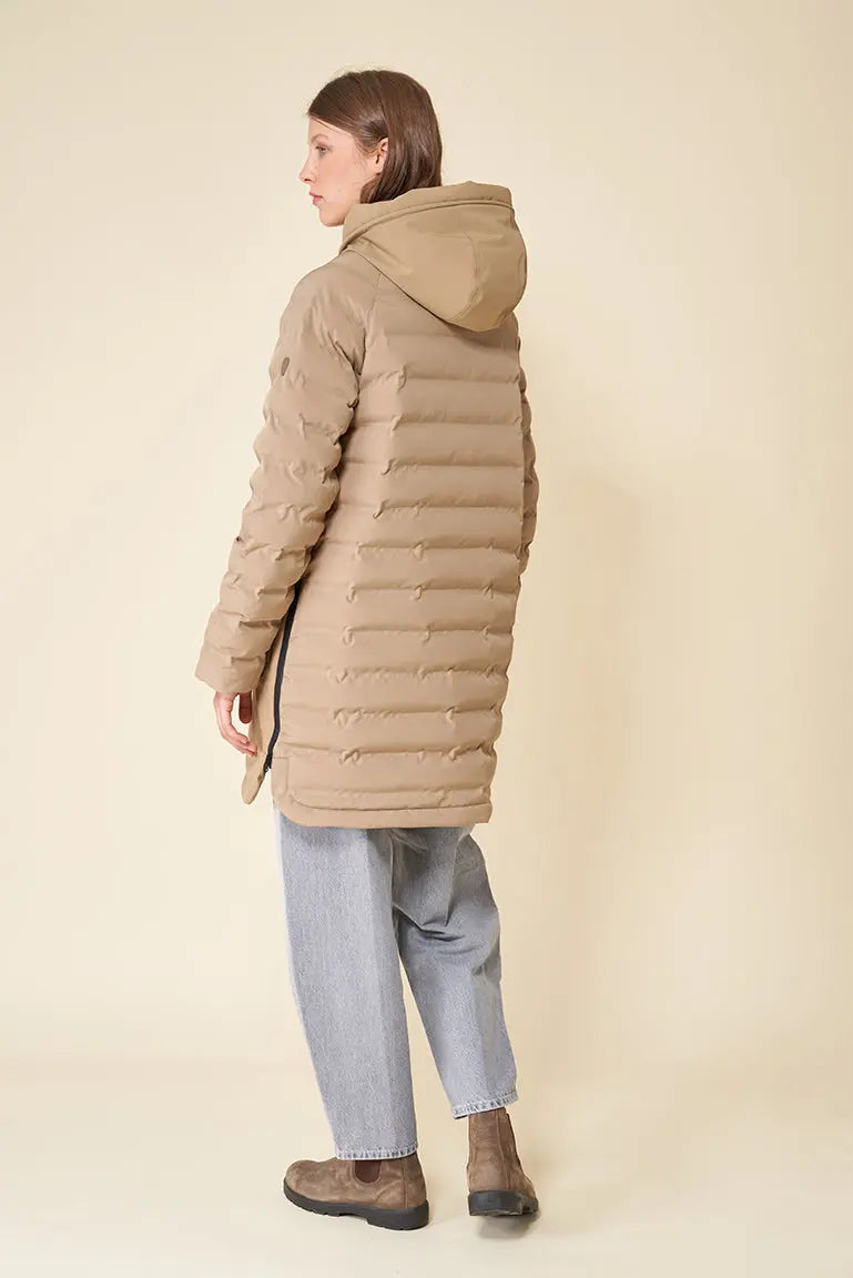 Descubre la protección total en los días invernales con el abrigo acolchado 100% impermeable Pyt. Diseñado para enfrentarse al frío, este chubasquero para mujer te brinda estilo y funcionalidad. Confeccionado con nuestro exclusivo tejido Softshell y forrado con tejido de algodón de diseño tweed, el abrigo ofrece una combinación única de durabilidad y elegancia. Su capa transpirable, libre de plumas, mejora la ventilación durante caminatas largas, manteniéndote cómoda. Los bolsillos plastrón con solapa y las cremalleras impermeables laterales añaden practicidad y estilo. Además, las correas interiores de mochila te permiten llevar la prenda con manos libres. Ajustado a la talla real, el abrigo Pyt es tu compañero perfecto para enfrentar el invierno con confianza y distinción. Color beis