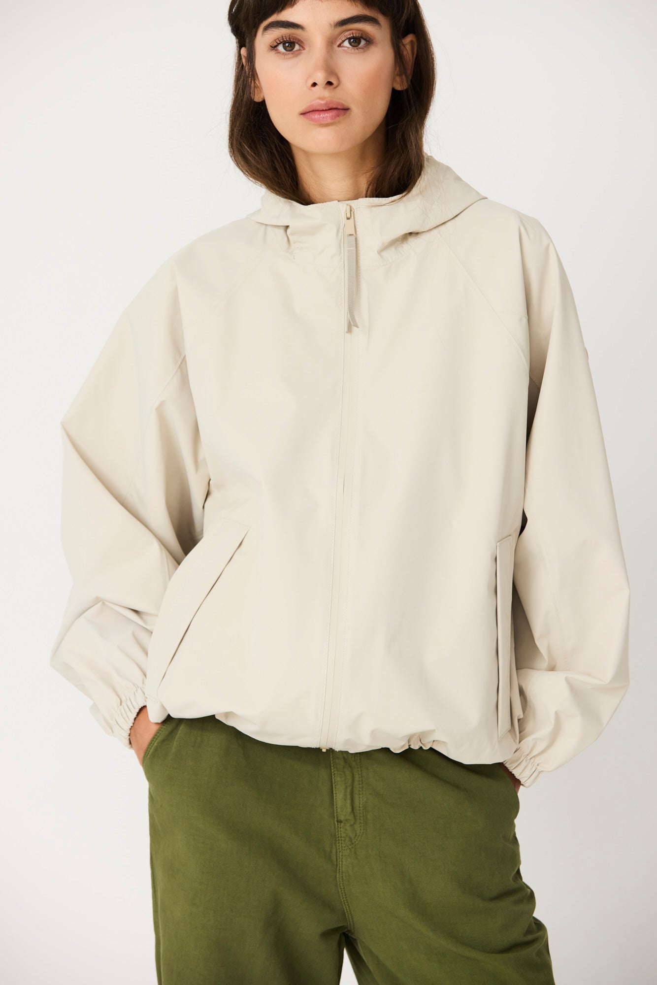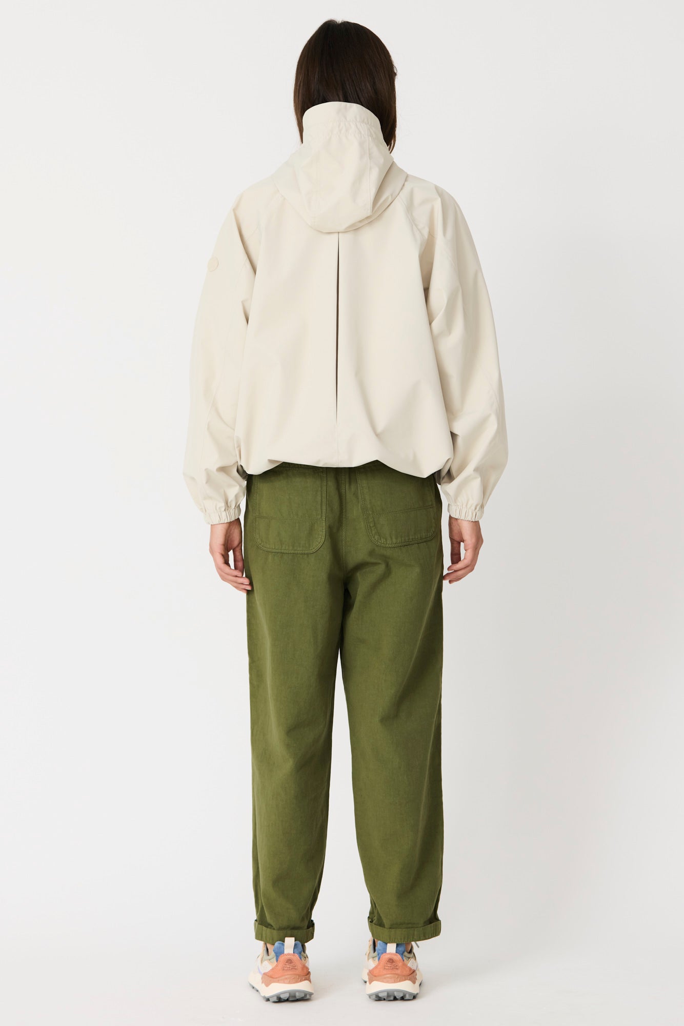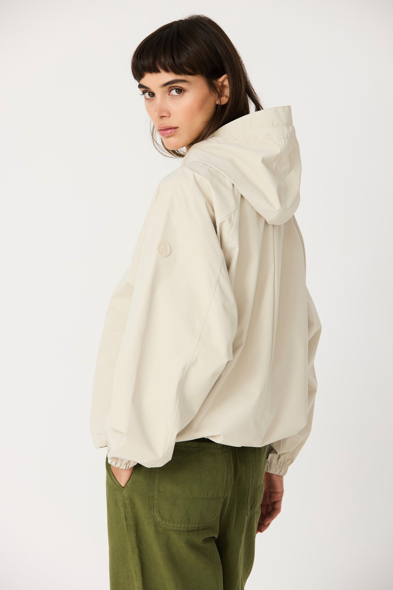Imiq es un impermeable joven y desenfadado confeccionado en tejido 100 % reciclado, diseñado con una silueta amplia y voluminosa. Los cortes de patronaje en las mangas aportan riqueza y movimiento, mientras que el pliegue en la espalda refuerza su forma relajada. Ligero y transpirable, se completa con una cremallera frontal impermeable y es 100 % waterproof, con todas las costuras selladas, combinando sostenibilidad, estilo y funcionalidad en un diseño fresco y contemporáneo.