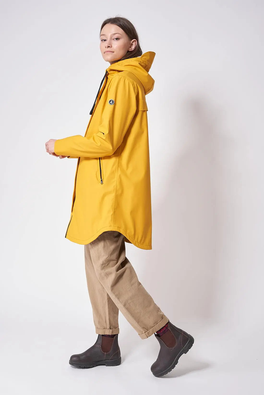 Ukkonen es un abrigo impermeable de mujer que combina una silueta en A con una forma curva en los laterales. Fabricado en poliuretano, está forrado con un aislamiento inteligente de fibra ligera tipo C que atrapa el calor corporal mientras permite que escape la humedad. Este aislamiento sin plumas y transpirable proporciona calidez y comodidad cuando la temperatura empieza a bajar. Es totalmente impermeable con todas las costuras selladas y está acabado con cierres magnéticos ocultos a presión en la parte delantera y una capucha ajustable que proporcionan una mayor protección contra la lluvia y el clima húmedo.